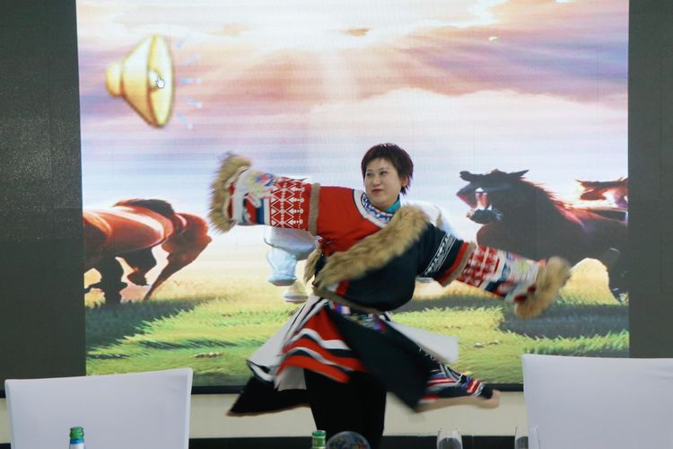 Wang Jiao from Hainan Qinweikang Marketing Company performs Mongolian dance